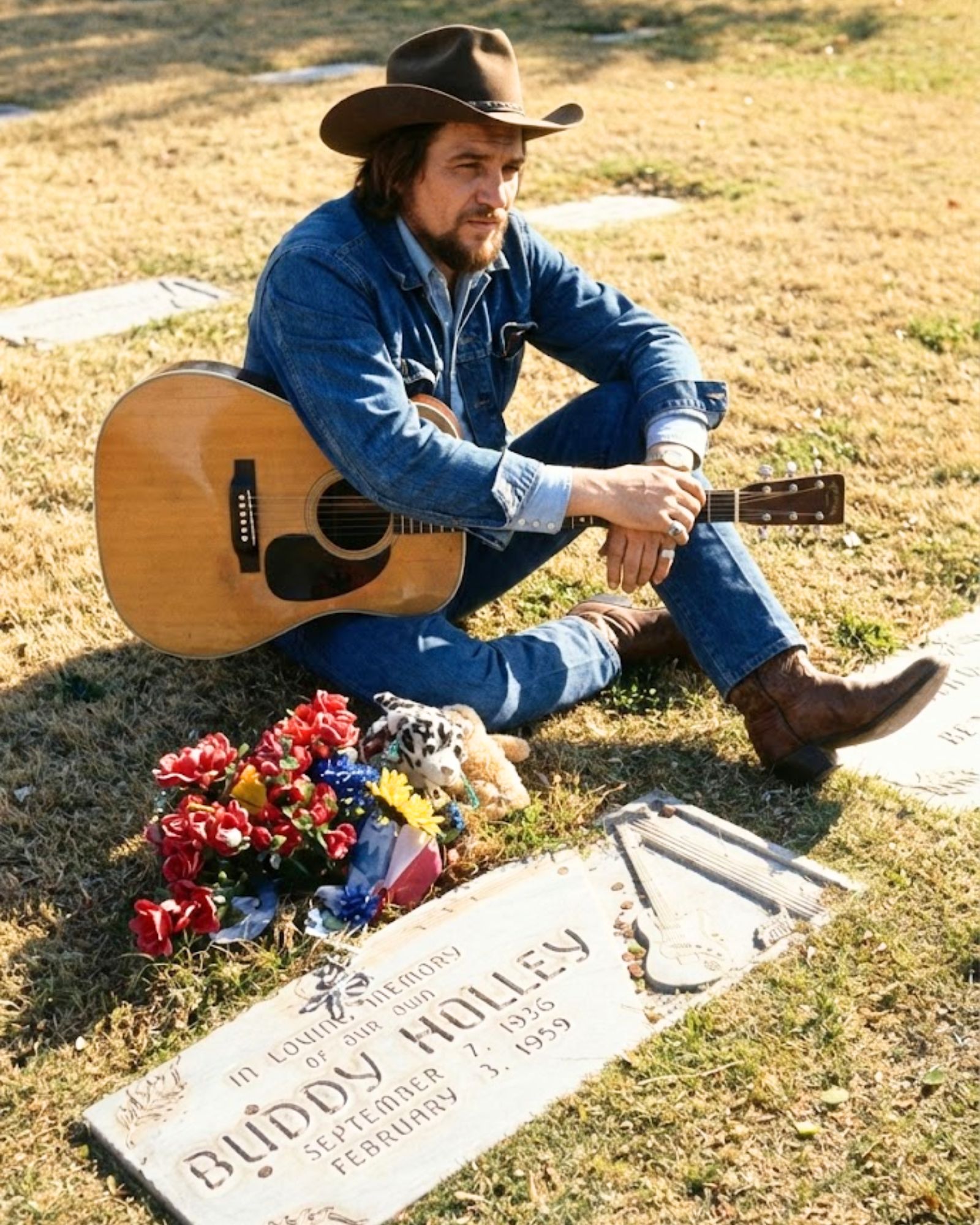 Long after the tour buses stopped running and the amps were packed away, Waylon Jennings found himself standing alone in a quiet Texas cemetery. The sun was low. The wind moved slow. And carved into the stone in front of him was a name that never stopped echoing through his life: Buddy Holly.
