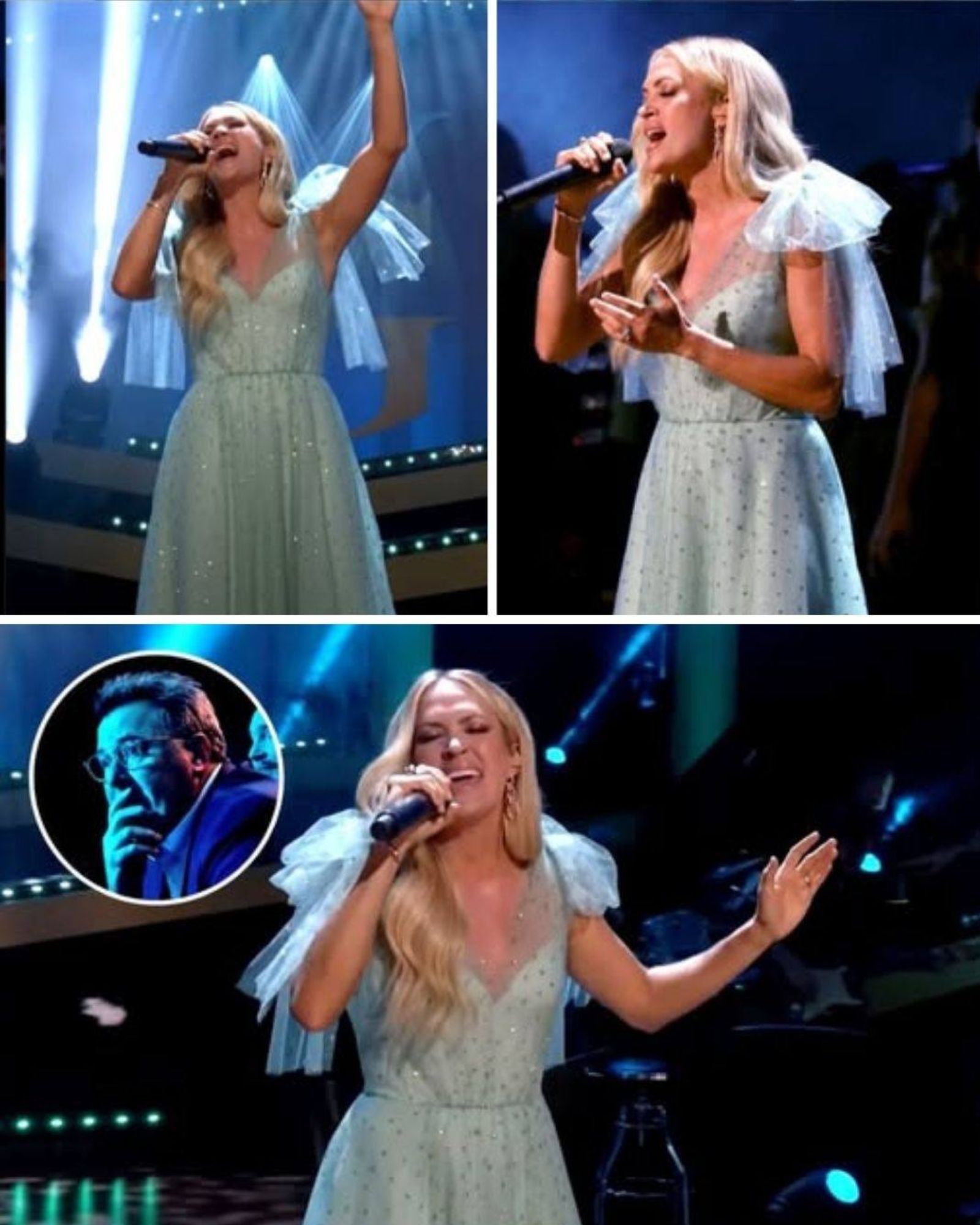 Dressed in a flowing blue gown, Underwood stood alone at center stage, her voice cascading through the hall with precision and emotion. Beginning in a hushed, tender tone, she gradually built the performance into a crescendo that seemed to lift the audience with her. It wasn’t just a cover — it was a prayer in song, weaving together themes of loss, faith, and redemption while staying true to the spirit of Gill’s original 1995 recording.