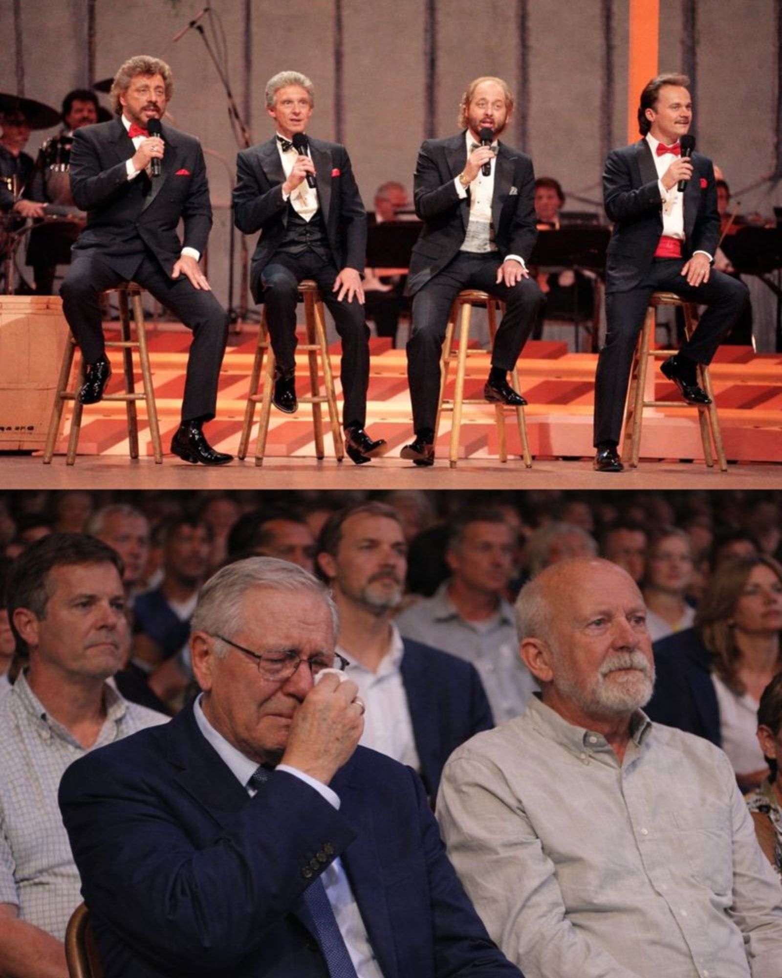 The song moved slowly, almost carefully, as if afraid of breaking something fragile. There was no lead singer stepping forward. No moment designed to draw cheers. The harmonies leaned into each other instead of reaching outward.