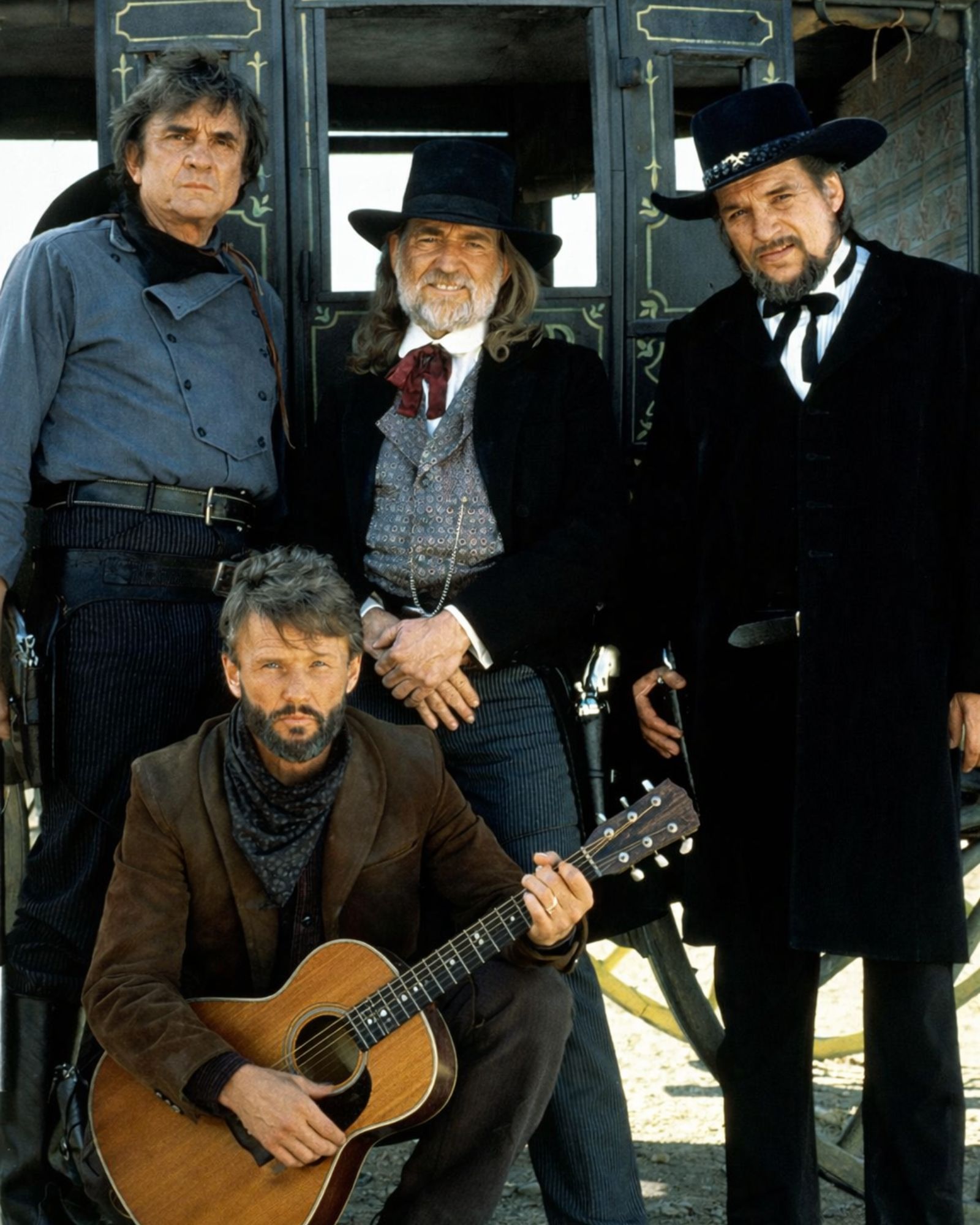 Johnny Cash stood like a man already judged, shoulders squared, face carved into something both stern and tender. Waylon Jennings carried defiance in his posture, the kind that says, try and take it from me. Kris Kristofferson watched the moment the way a writer watches the last page of a story he knows will outlive him—quiet, observant, almost protective of what it means.